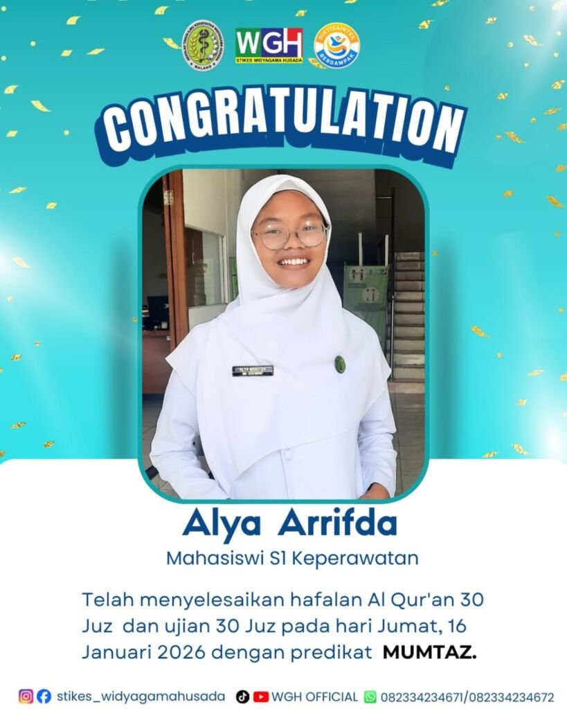 Selamat dan penghargaan setinggi-tingginya kepada Alya Arrifda, mahasiswa tahfidz Prodi S1 Keperawatan semester 5 atas keberhasilannya menyelesaikan hafalan Al-Qur’an 30 Juz serta lulus ujian 30 Juz dengan predikat Mumtaz.