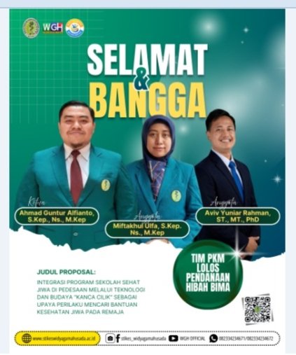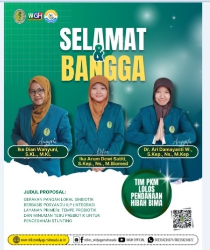 Tiga proposal PKM BIMA yang lolos diantaranya adalam proposal yang diajukan oleh ibu Ika Arum Dewi Dewi Satiti, S.Kep., Ns., M.Biomed (ketua), Ibu Dr. Ari Damayanti W., S.Kep., Ns., M.Kep (anggota) dan ibu Ike Dian Wahyuni, S.KL., M.KL (anggota) dengan judul Gerakan Pangan Lokal Sinbiotik Berbasis Posyandu ILP ( integrasi layanan primer): Tempe Probiotik dan Minuman Tebu Prebiotik untuk Pencegahan Stunting. Tim kedua terdiri dari bapak Ahmad Guntur Alfianto, S Kep., Ns., M.Kep. (Ketua), ibu Miftakhul Ulfa, S. kep. Ns., M. Kep. (anggota) dan bapak Aviv Yuniar Rahman, ST. MT. PhD dari UWG (anggota) mengajukan judul proposal Integrasi Program Sekolah Sehat Jiwa di Pedesaan melalui Teknologi dan Budaya “Kanca Cilik” sebagai Upaya Perilaku Mencari Bantuan Kesehatan Jiwa pada Remaja.